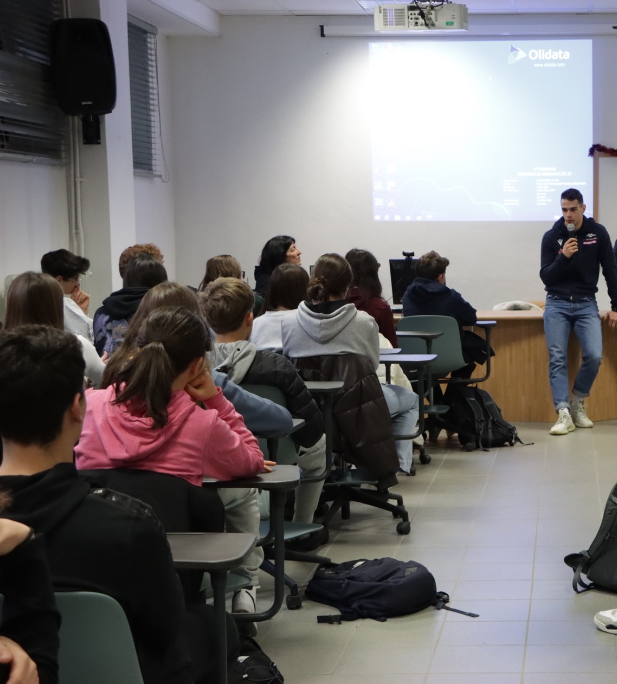 Il libero biancorosso Leonardo Scanferla e il tecnico Renato Barbon a scuola al Liceo Scientifico Lorenzo Respighi