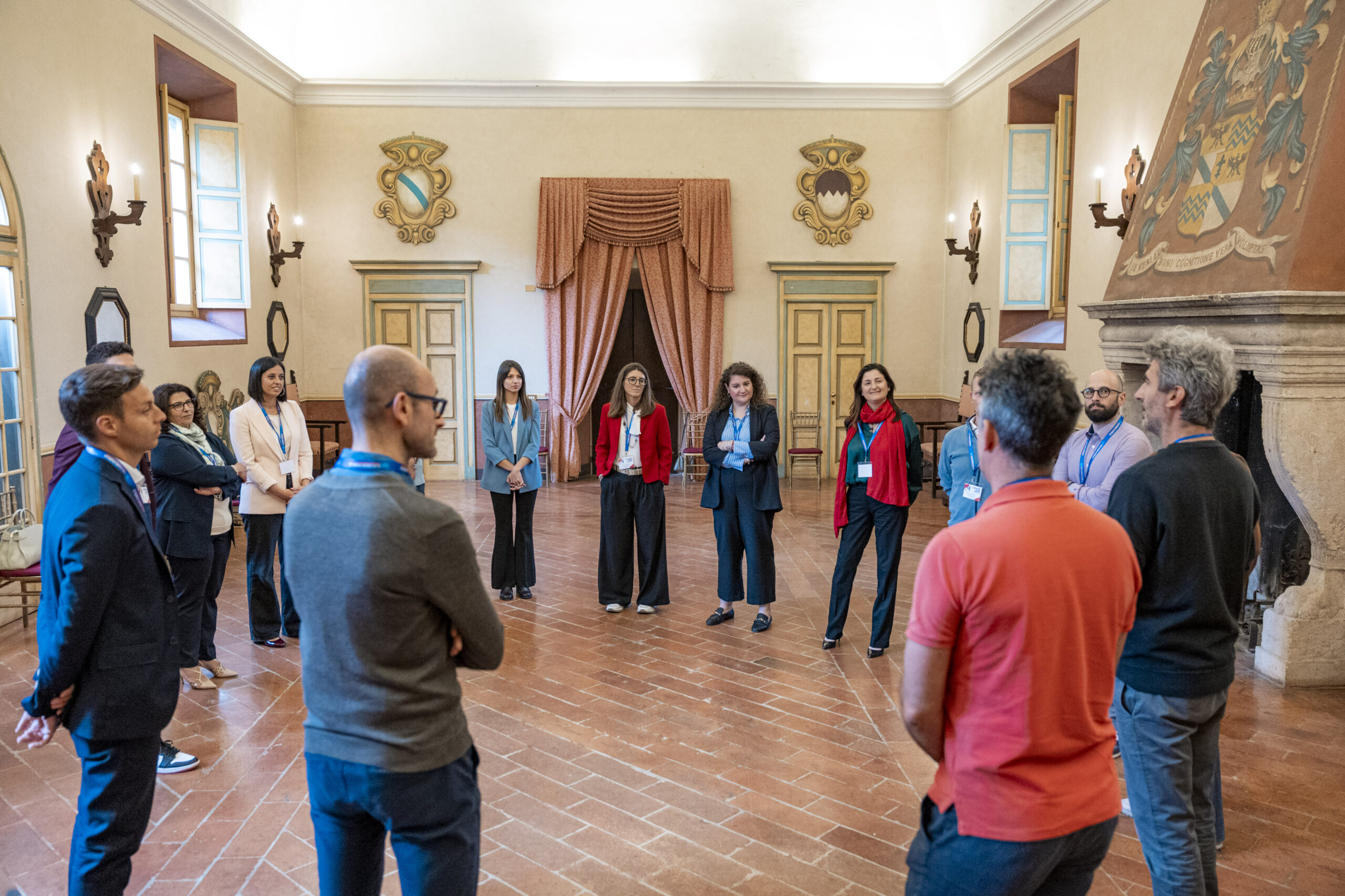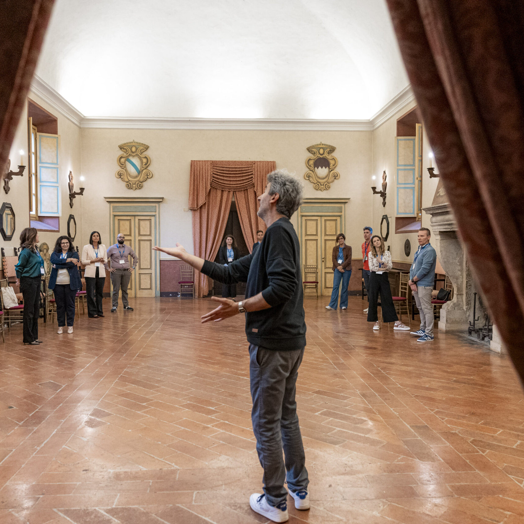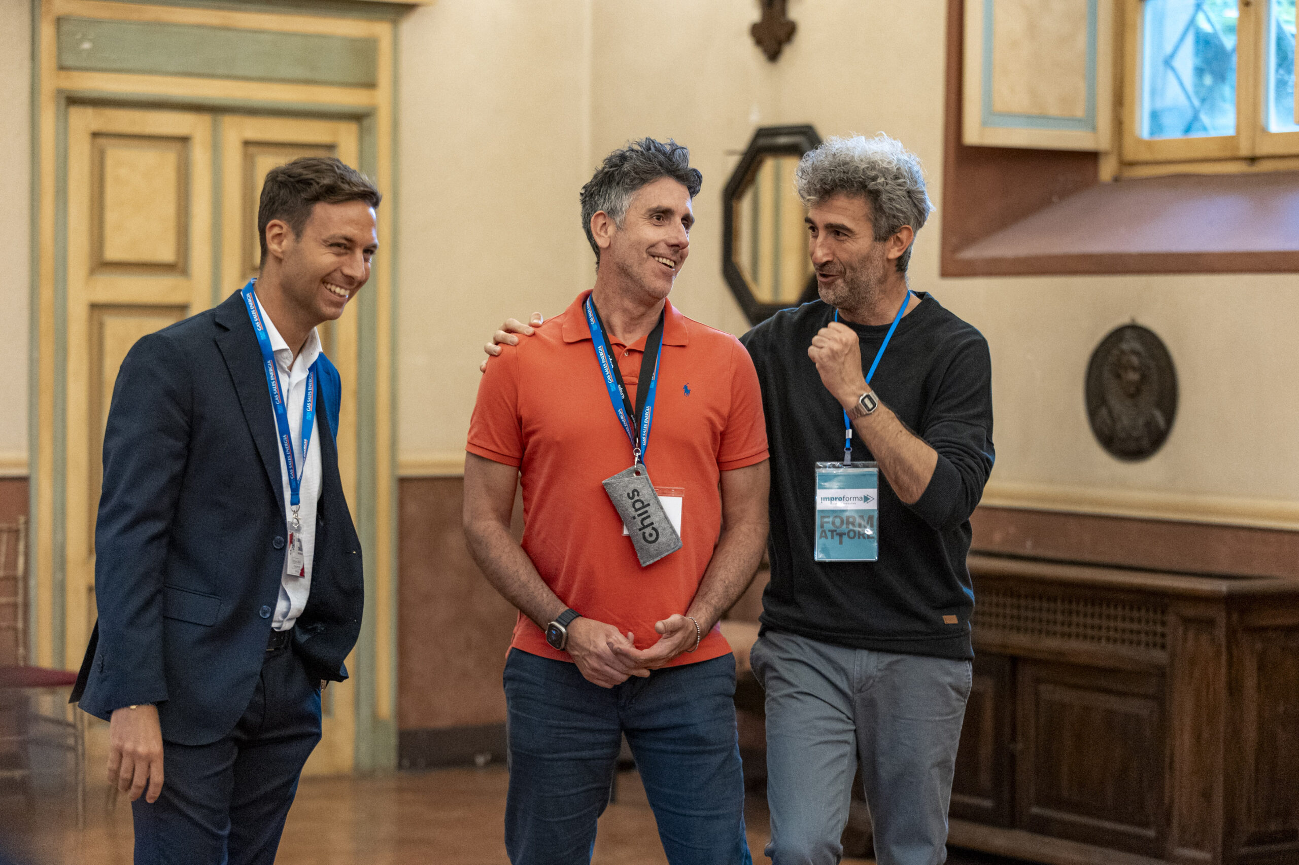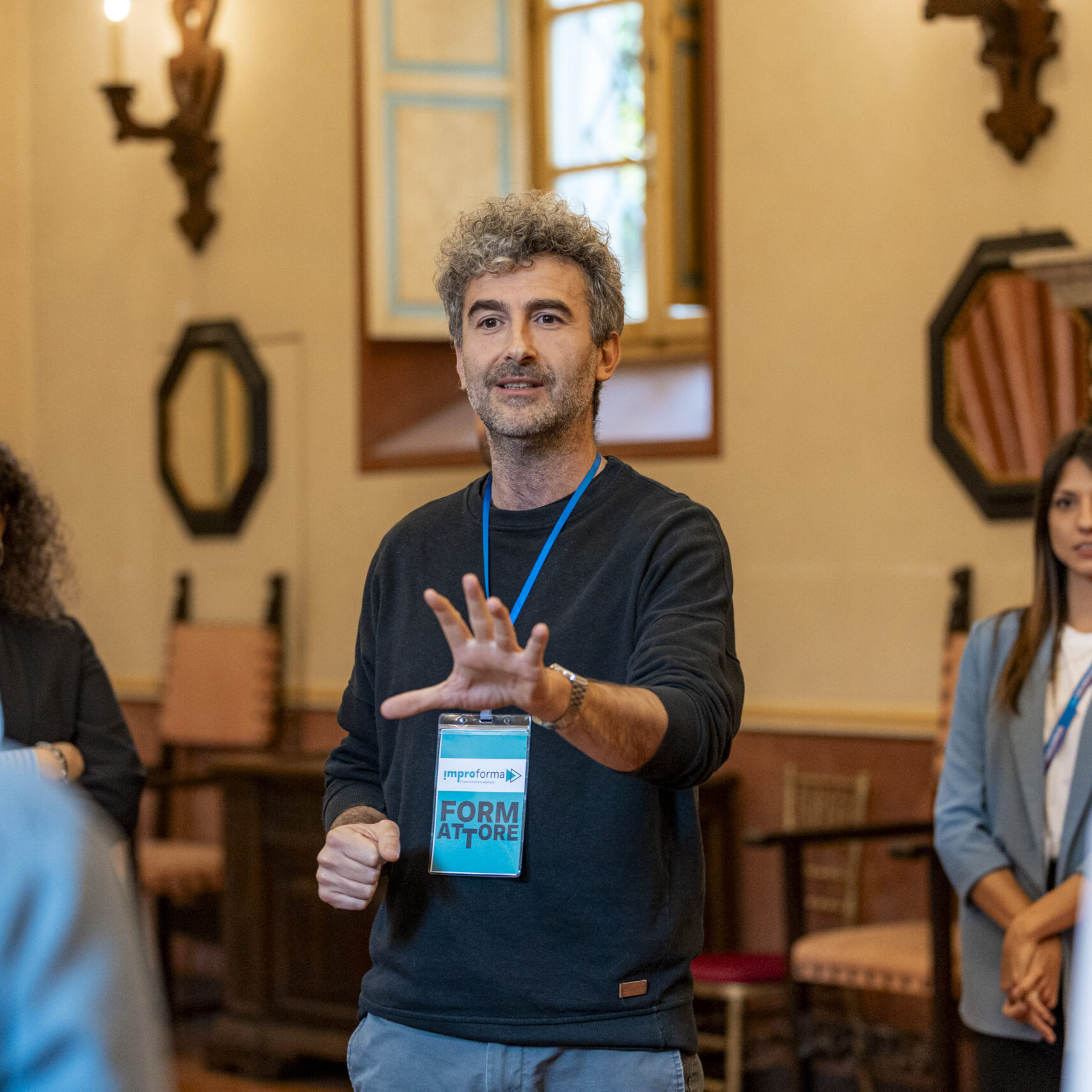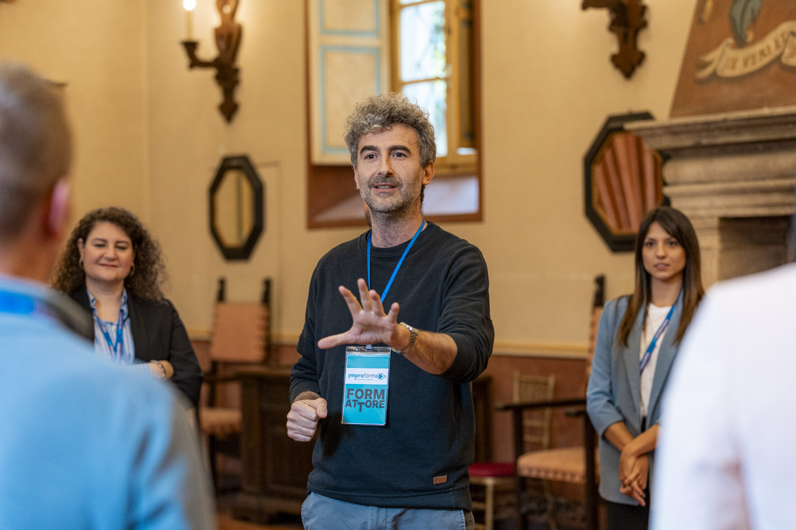 Alla fine delle singole attività, gli ospiti si sono nuovamente riuniti nel salone d’onore per assistere allo spettacolo finale di improvvisazione teatrale che ha visto protagonisti sia i formatori che alcuni sponsor, dando vita a un momento di partecipazione attiva e divertente.