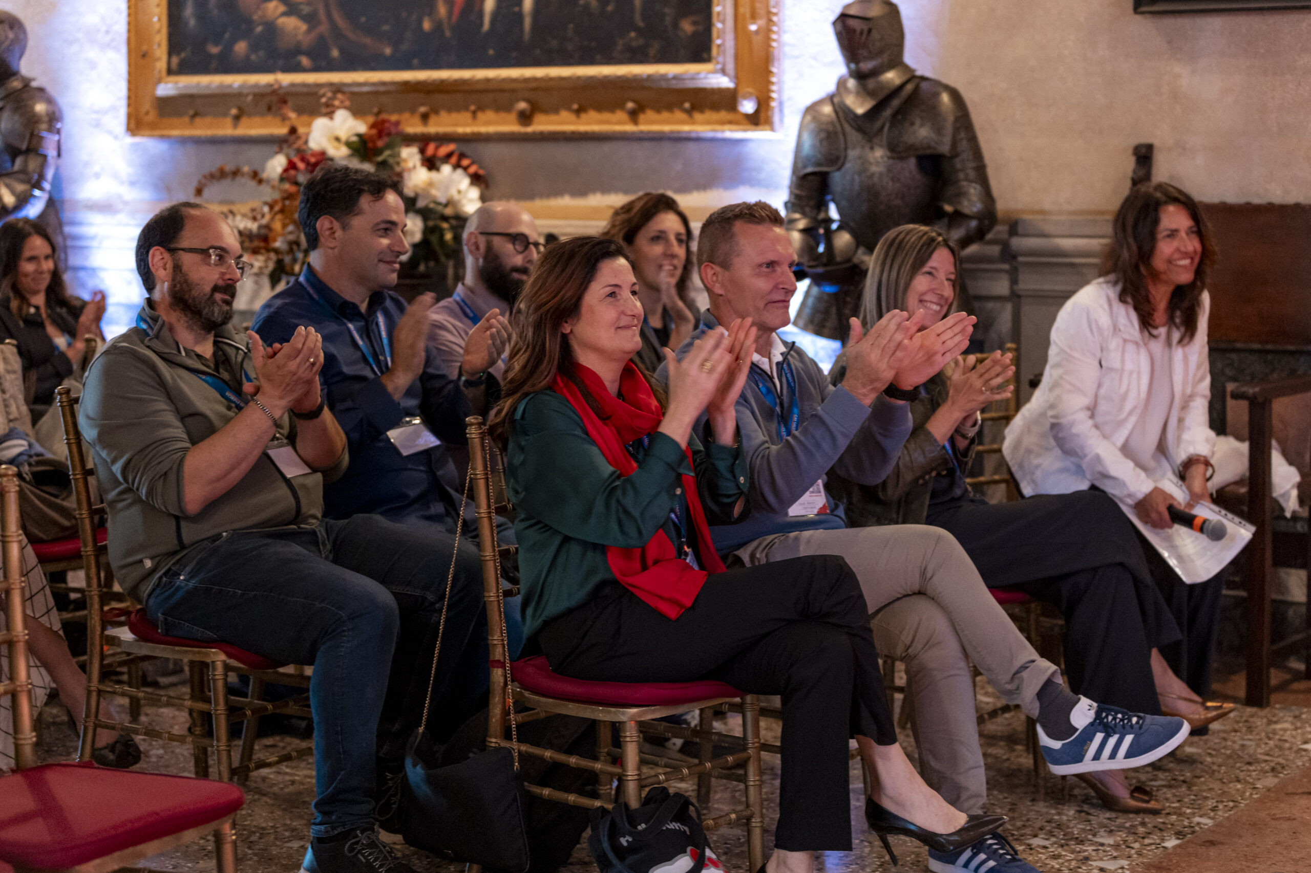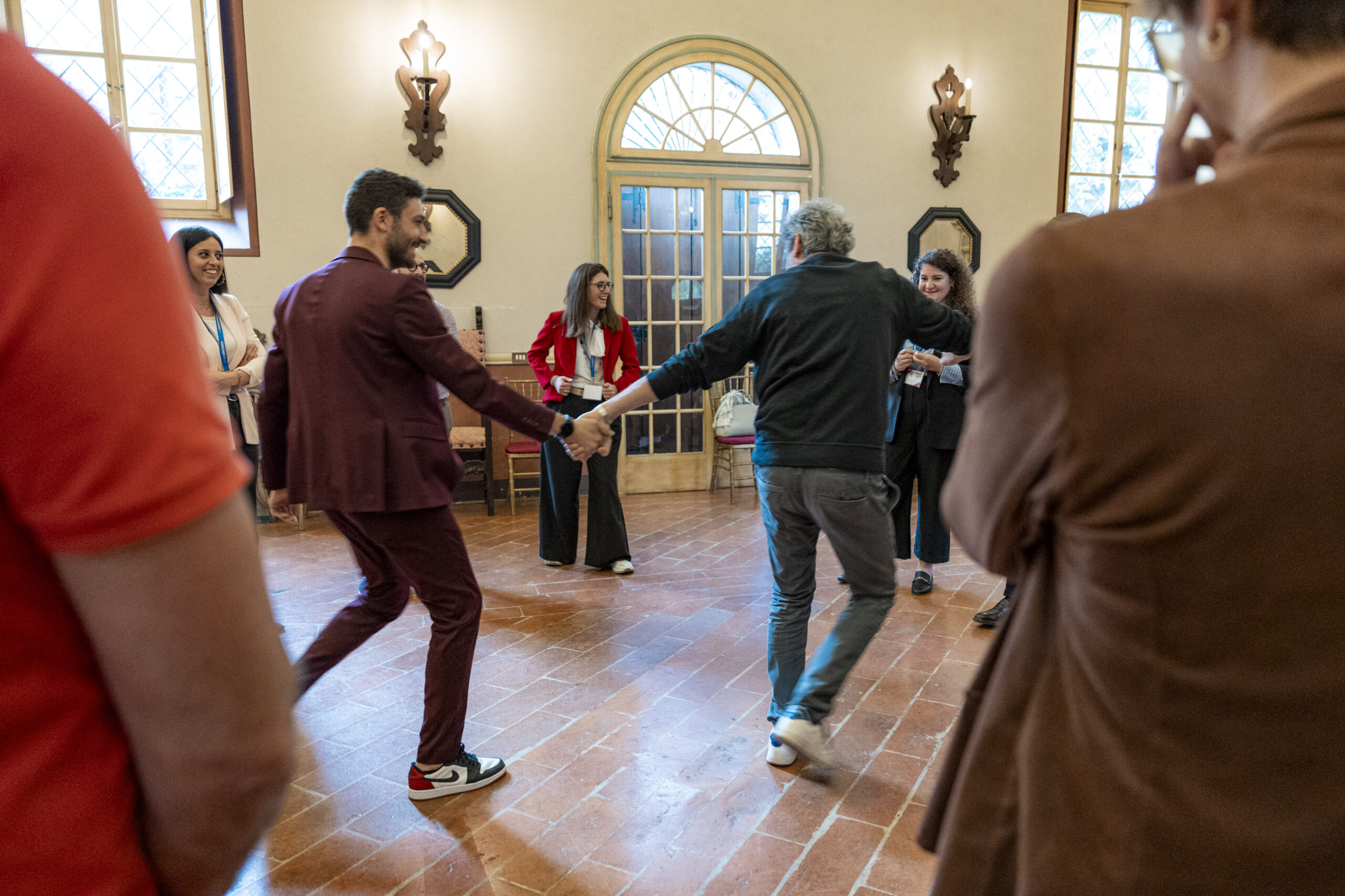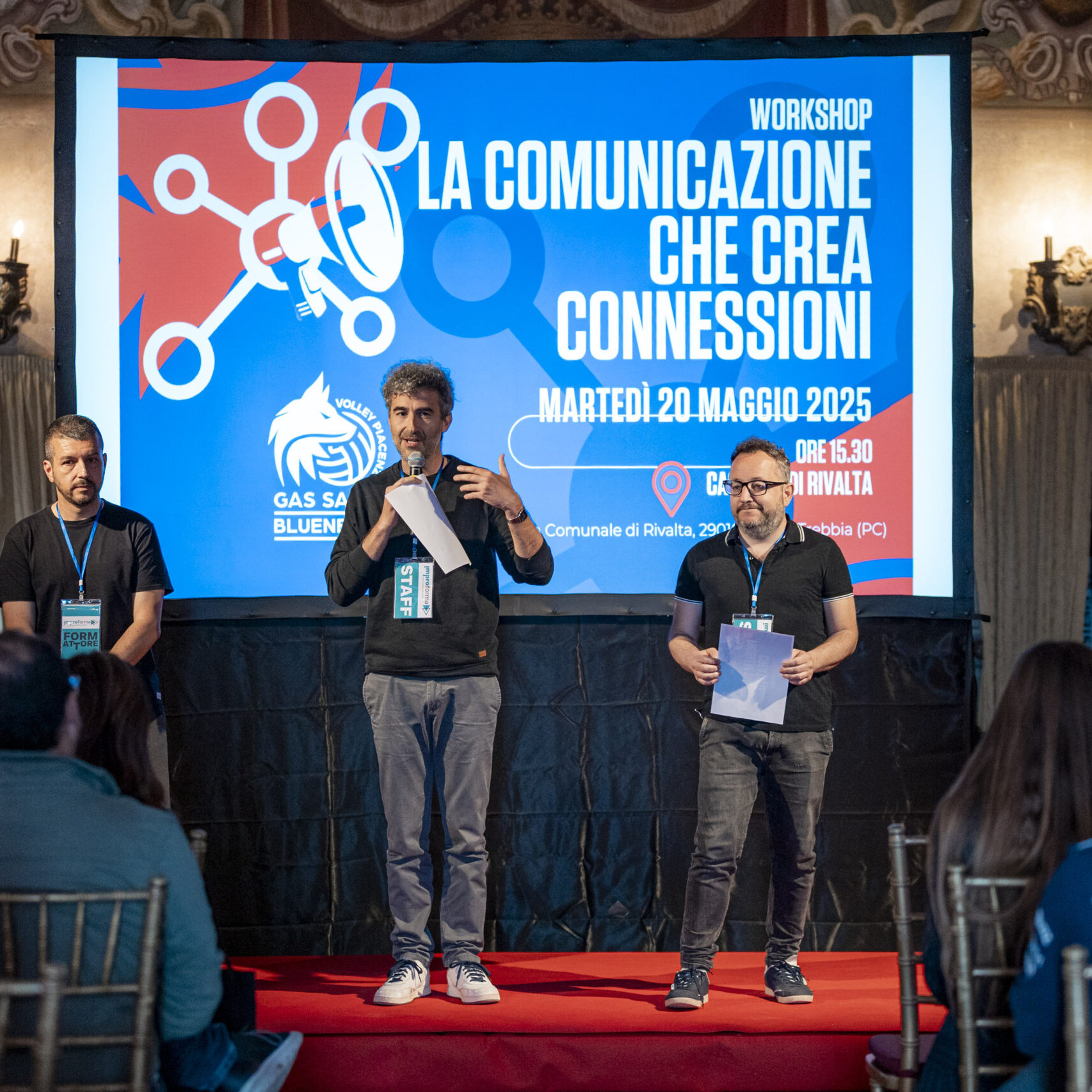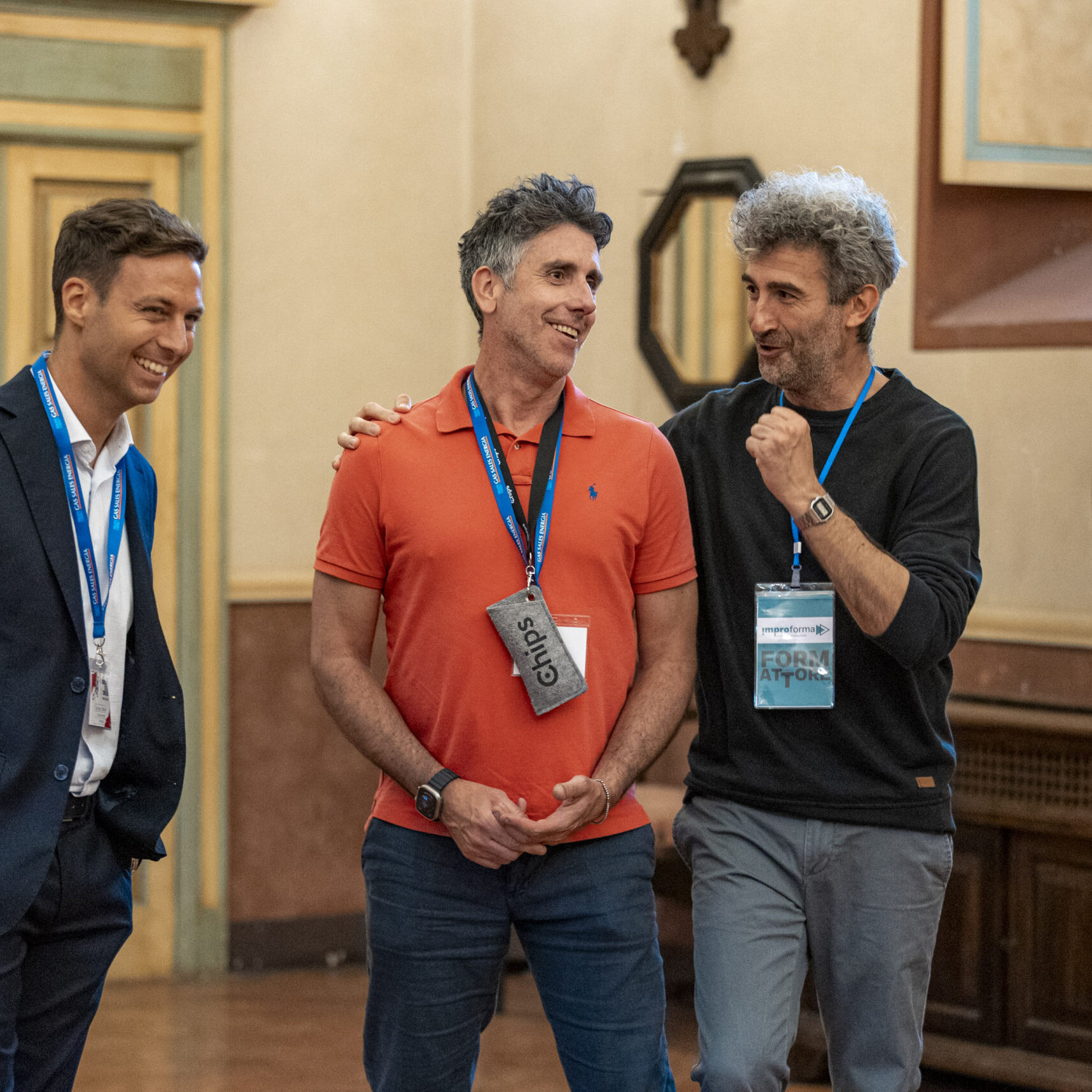 Alla fine delle singole attività, gli ospiti si sono nuovamente riuniti nel salone d’onore per assistere allo spettacolo finale di improvvisazione teatrale che ha visto protagonisti sia i formatori che alcuni sponsor, dando vita a un momento di partecipazione attiva e divertente.